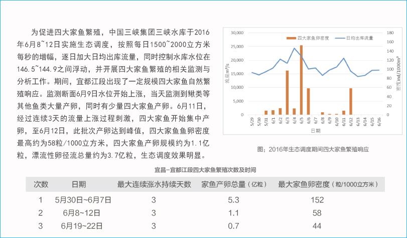 2017年,三峽水庫實施了兩次針對四大家魚自然繁殖的生態(tài)調度,調度期間宜都江段四大家魚繁殖規(guī)模達到10.8億顆。2011-2017年四大家魚年均自然繁殖產卵規(guī)模較2010年增加15倍,長江中下游其他小型魚類自然繁殖規(guī)模也大幅增加,調度效果顯著,有效促進長江中下游魚類種群資源的恢復,推動長江水生生態(tài)系統(tǒng)健康發(fā)展。2016-2017年,中華鱘研究所將環(huán)境DNA技術應用于四大家魚繁殖監(jiān)測工作中,使產卵場定位更加精準,提高對自然繁殖規(guī)律的認識。