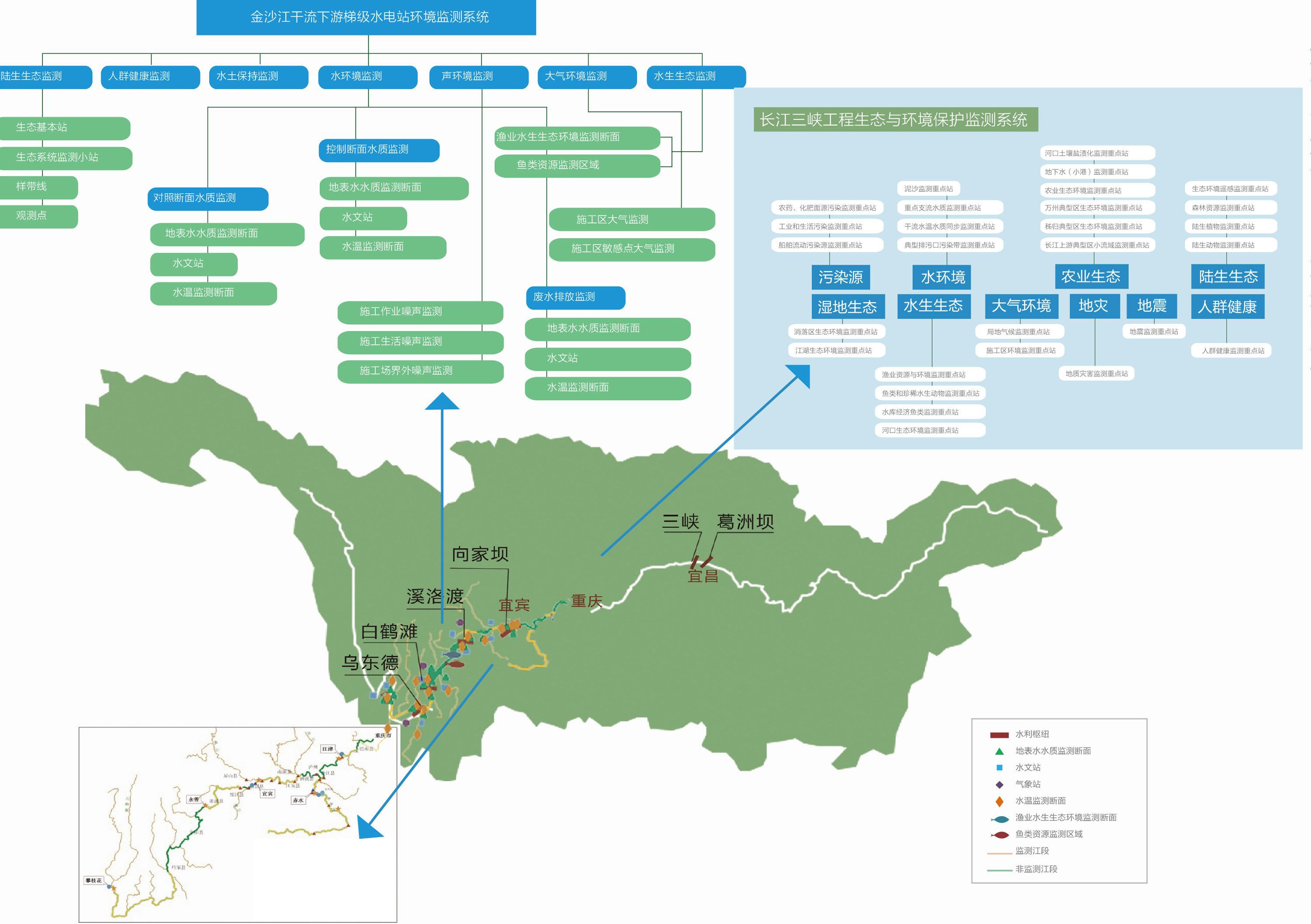 中國三峽集團通過包括長江三峽工程生態(tài)與環(huán)境保護監(jiān)測系統(tǒng)、金沙江干流下游流域生態(tài)環(huán)境監(jiān)測系統(tǒng)和長江上游珍稀特有魚類國家級自然保護區(qū)及相關水域水生生態(tài)監(jiān)測系統(tǒng)等在內的生態(tài)與環(huán)境監(jiān)測體系,覆蓋中國三峽集團國內所有大型水利工程所在流域及影響區(qū)域,主要對各工程施工區(qū)及流域的環(huán)境狀況、水電站運行對流域生態(tài)環(huán)境的影響區(qū)域,主要對各工程施工區(qū)及流域的環(huán)境狀況、水電站運行對流域生態(tài)環(huán)境的影響、環(huán)境保護措施的效果進行長期監(jiān)測與評估,并對實時更新數(shù)據(jù)進行信息化管理。