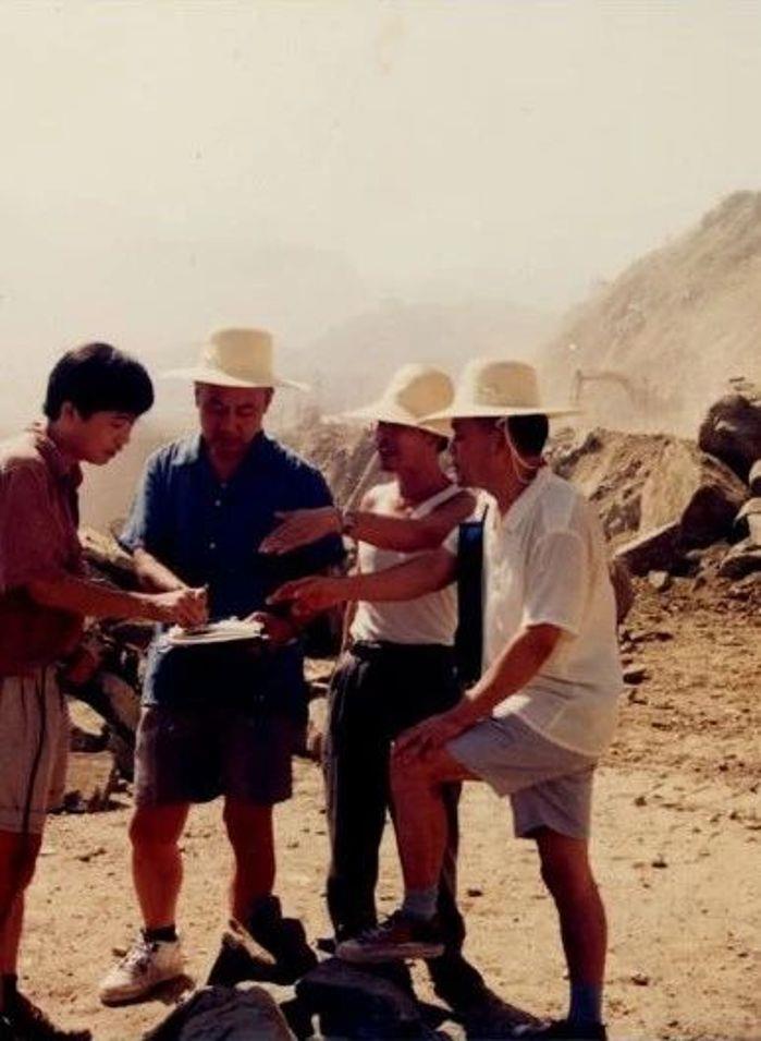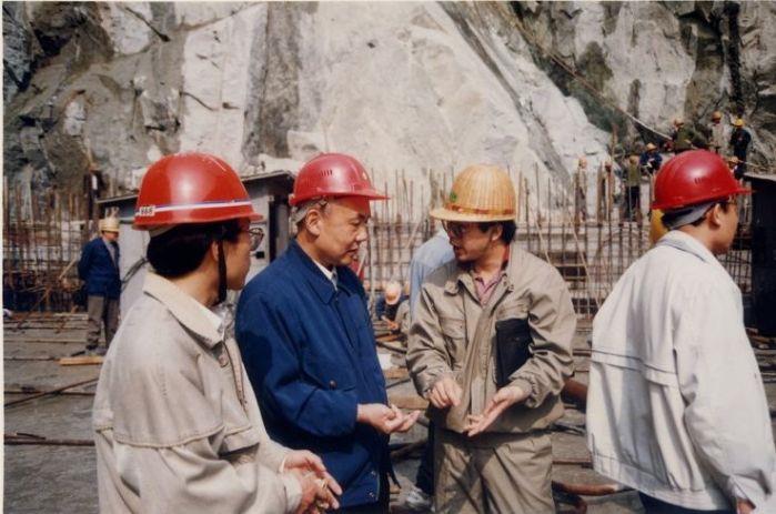 1994年,導(dǎo)流明渠右邊坡設(shè)計(jì),鄭守仁(左二)與地質(zhì)人員在現(xiàn)場研究危巖體處理