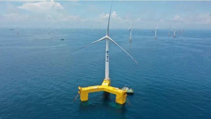 ▲我國首個漂浮式海上風電平臺,搭載全球首臺抗臺風型漂浮式海上風電機組,組成“三峽引領號”。