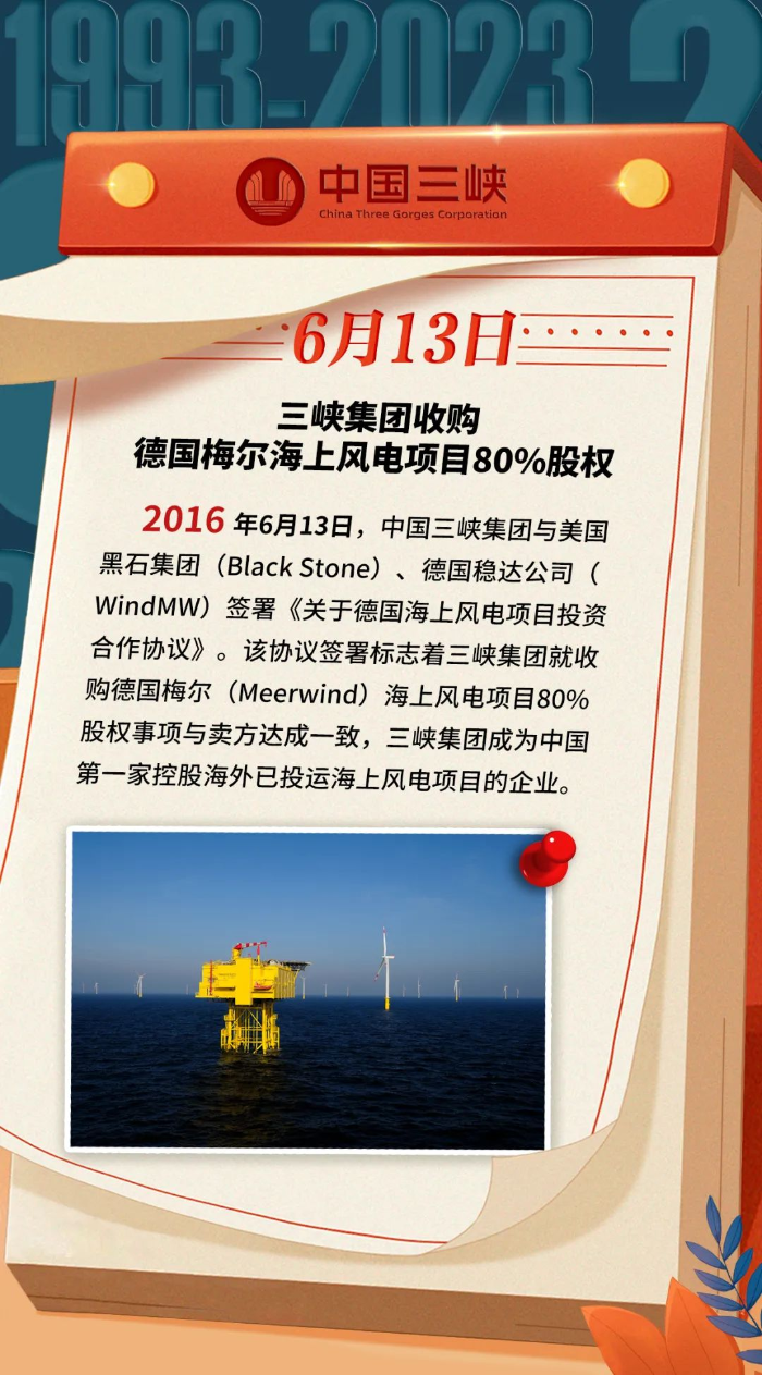 三峽·歷史上的今天丨三峽集團(tuán)收購(gòu)德國(guó)梅爾海上風(fēng)電項(xiàng)目80%股權(quán)(6月12日-6月18日)
